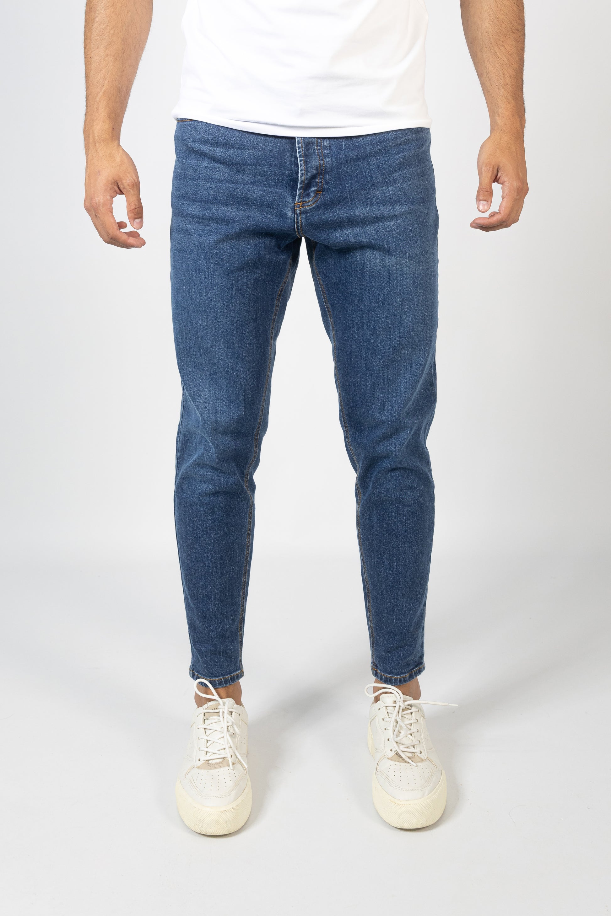 Skinny fit trousers with five pockets. Long cropped top, front button fastening.