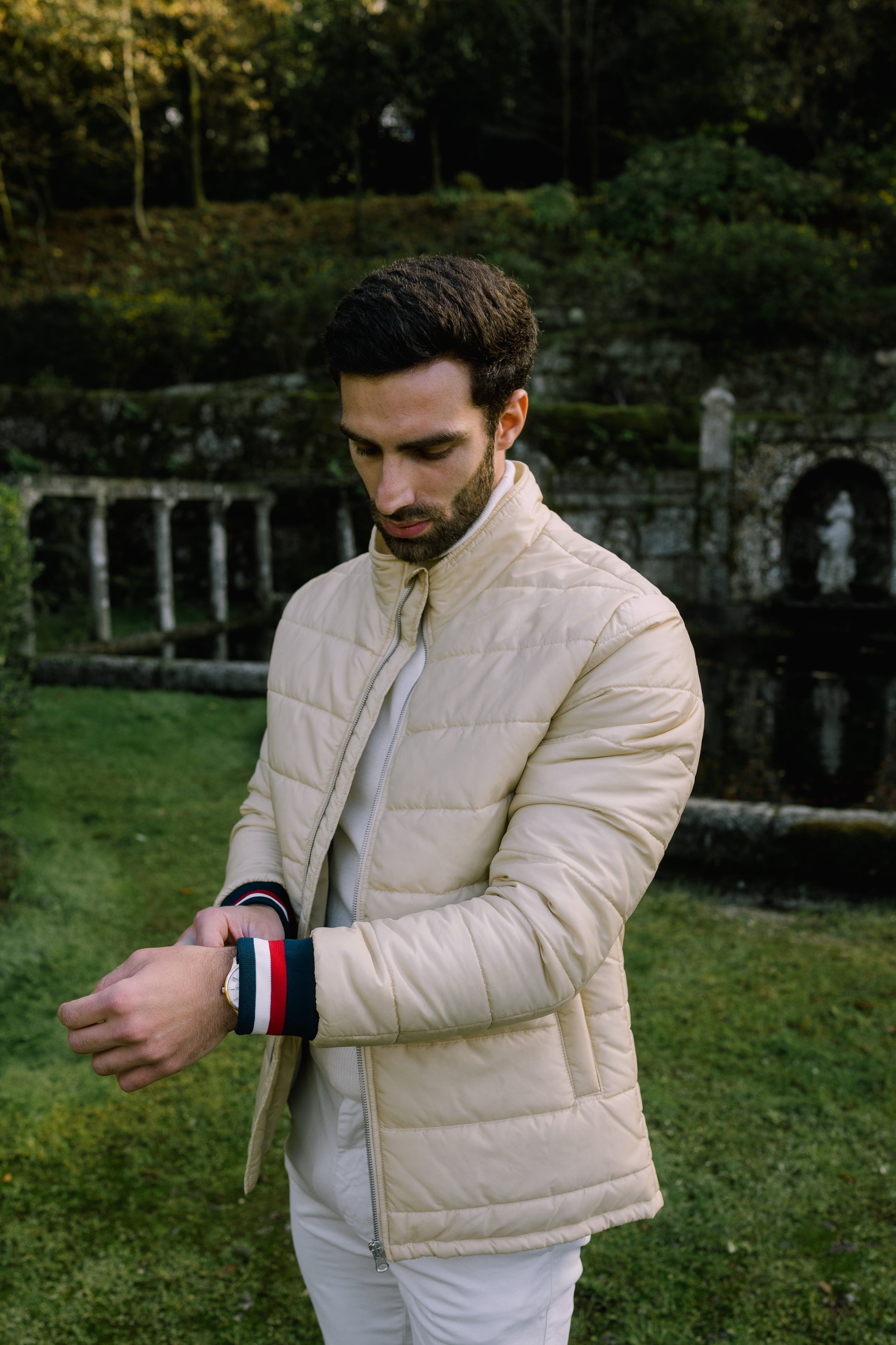 Blusão acolchoado de gola alta e manga comprida acabada em punho elástico. Bolsos laterais. Fecho de correr à frente.
