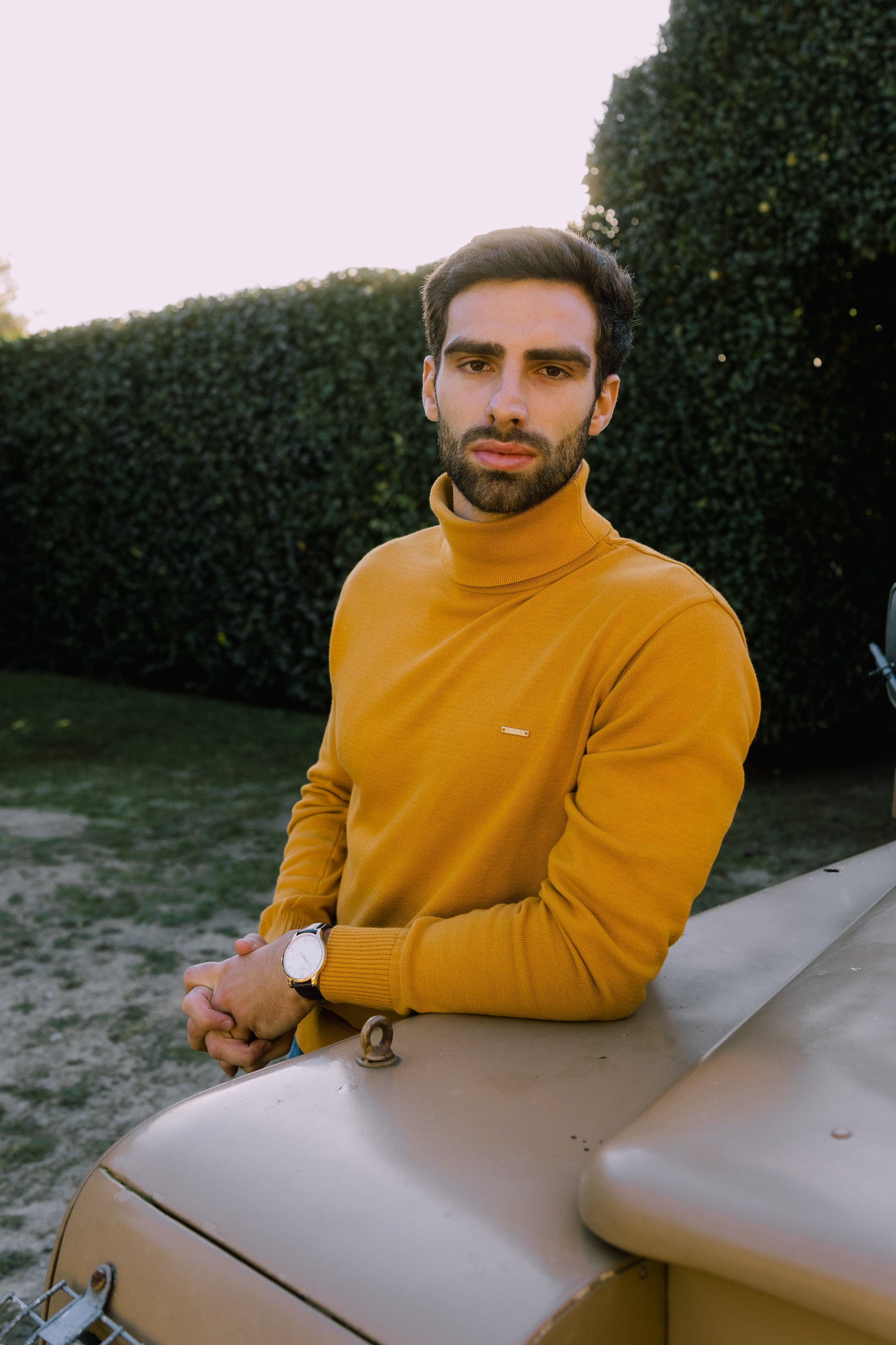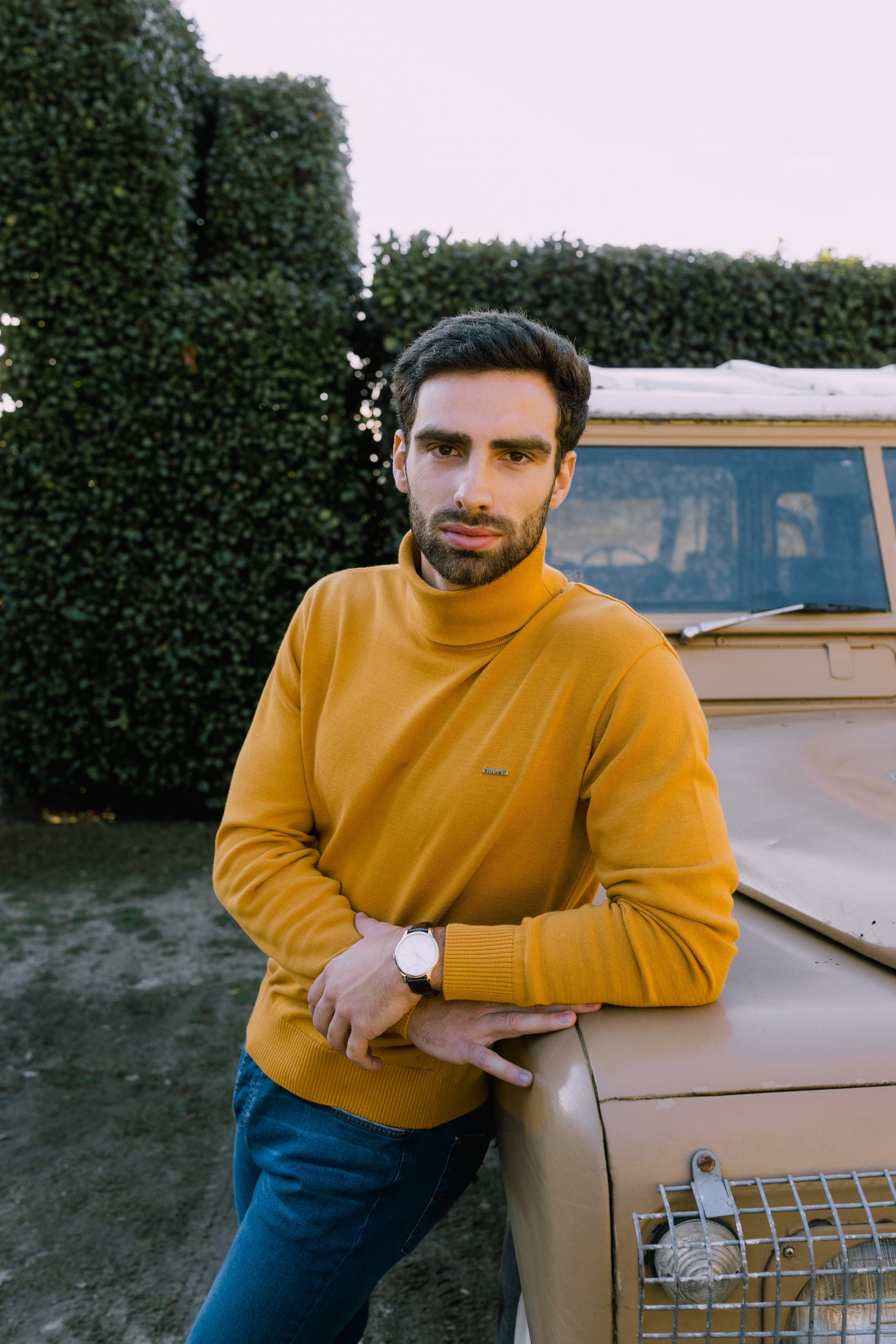 Camisola ligeira de corte direito com gola alta e manga comprida. Acabamento em nervuras.